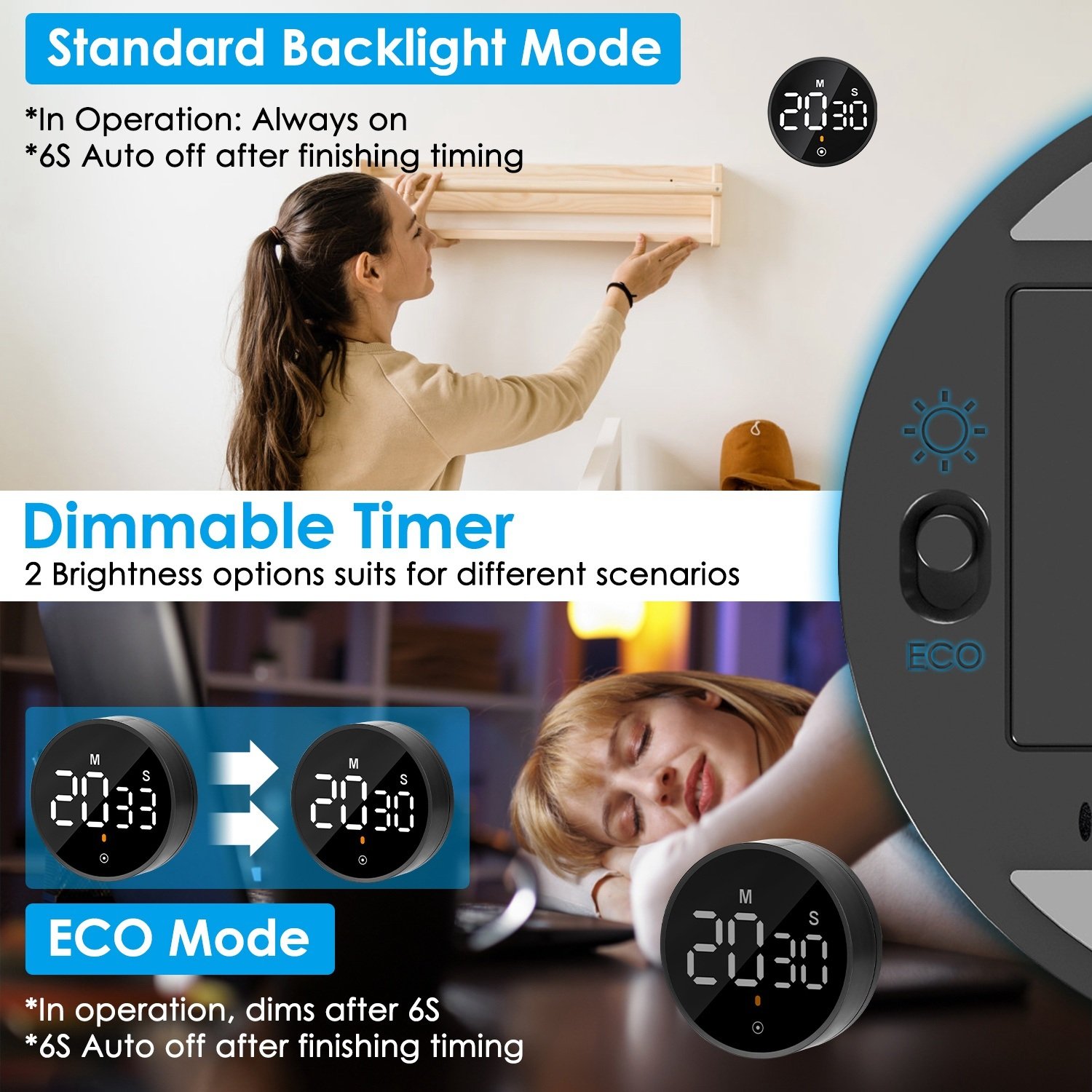 *Energy Saving Timer*:Kitchen timer has 2 brightness modes. Normal mode:the brightness is constant. Power saving mode(ECO Mode):the digits will be dim in 6s. 6S Auto off after countdown/count up completes.