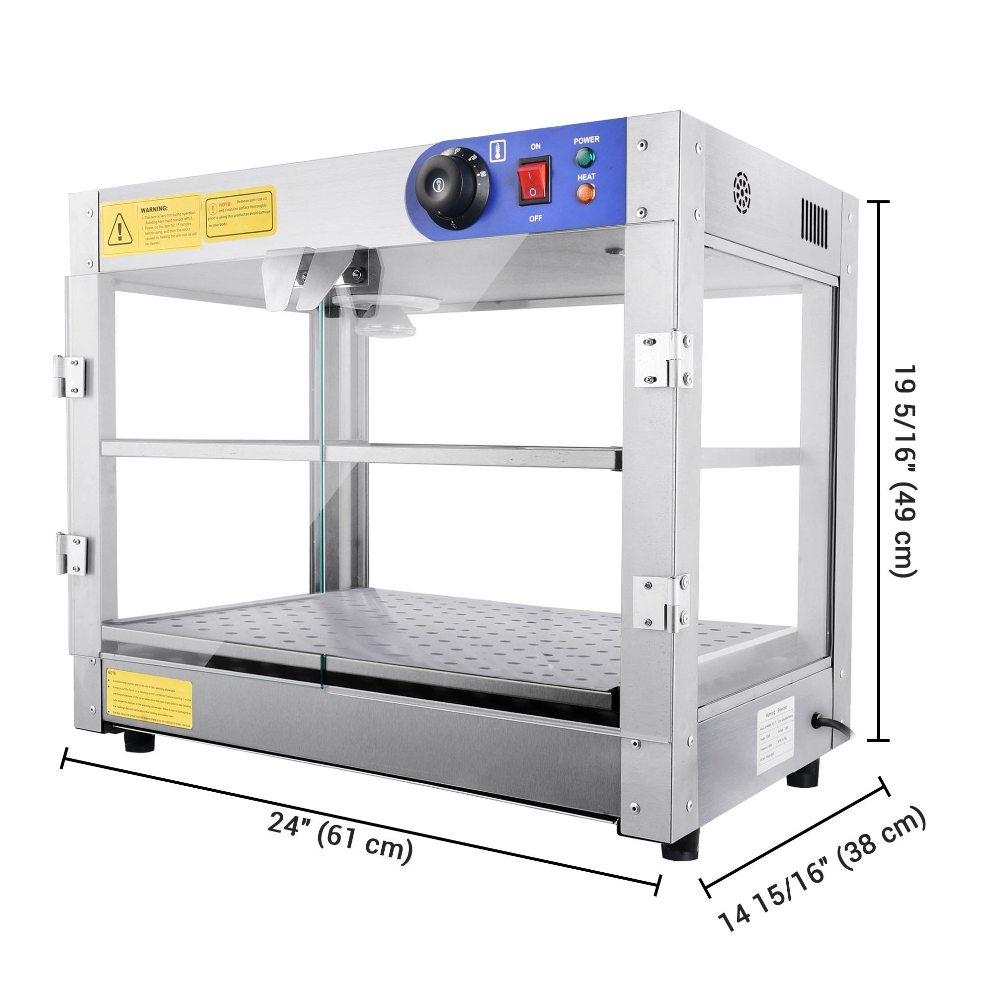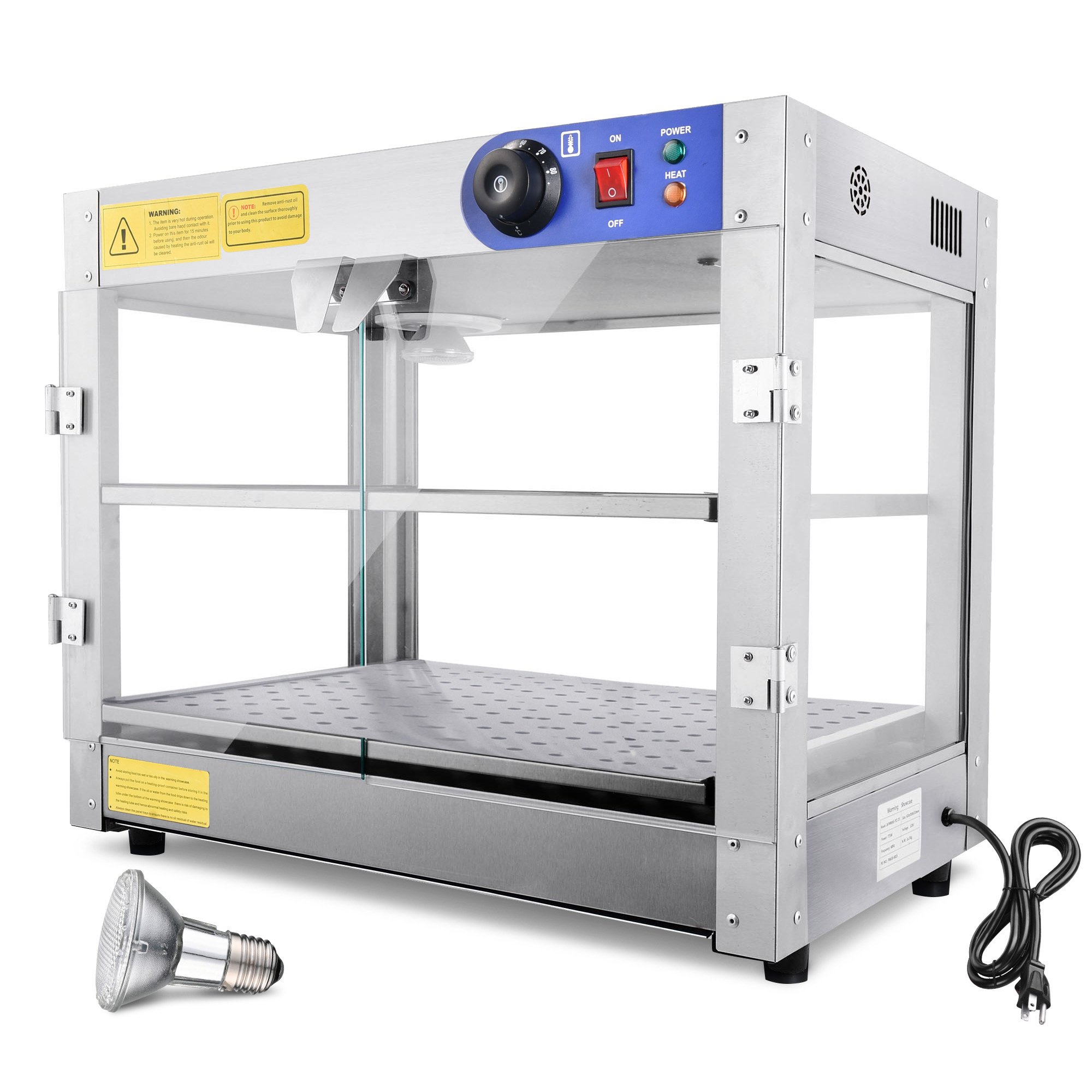 - Internal Illuminating Light - Built-in a 25W bulb at the top of the food warmer for illuminating the display case; bright and eye-catching; making your food looks more attractive and lustrous; comes with a spare bulb for easy replacement