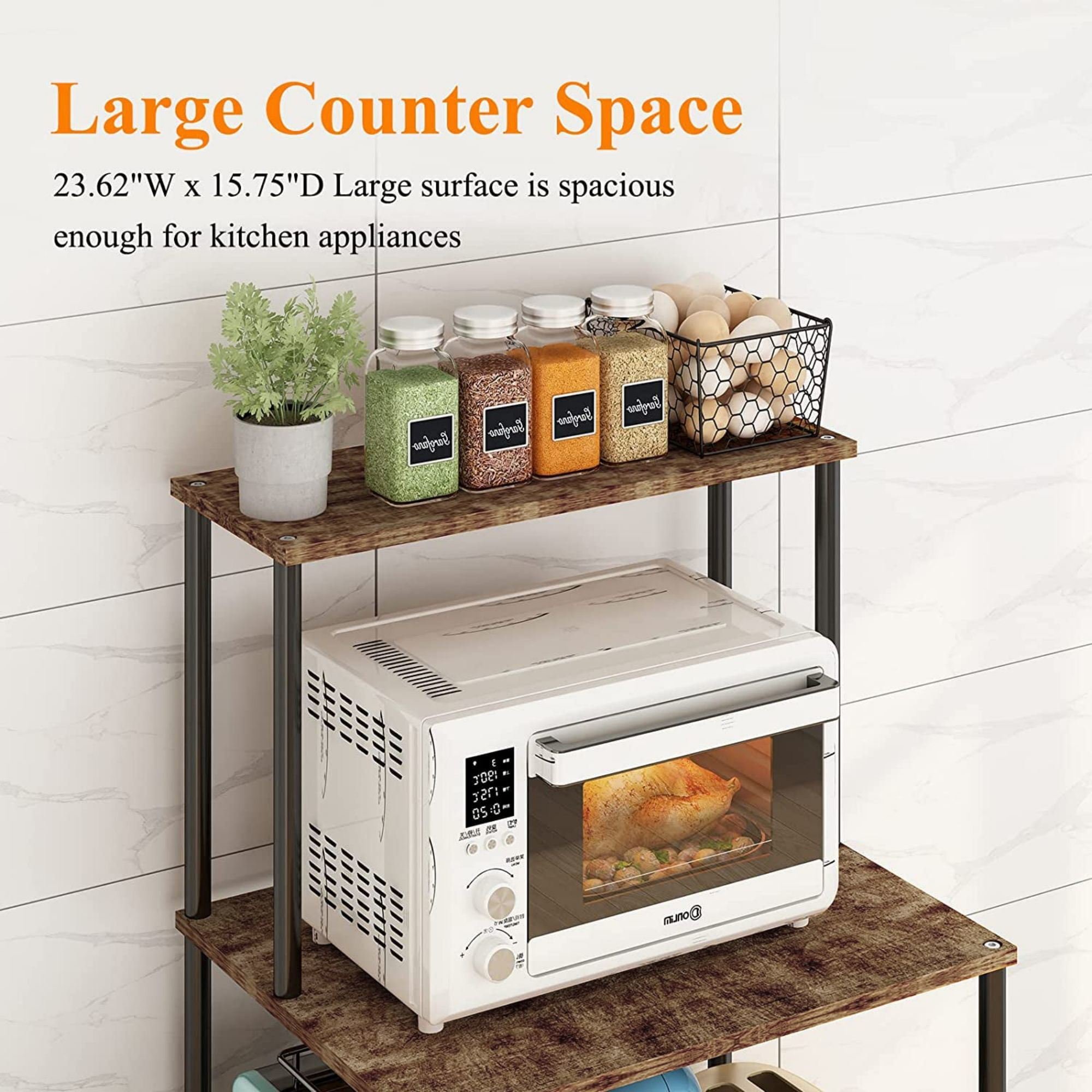 The microwave oven rack has four layers of open storage racks. The upper two layers can accommodate microwave ovens, coffee machines, seasoning bottles, and kitchen decorations, while the lower two layers can accommodate kitchen supplies such as vegetables and cooking utensils