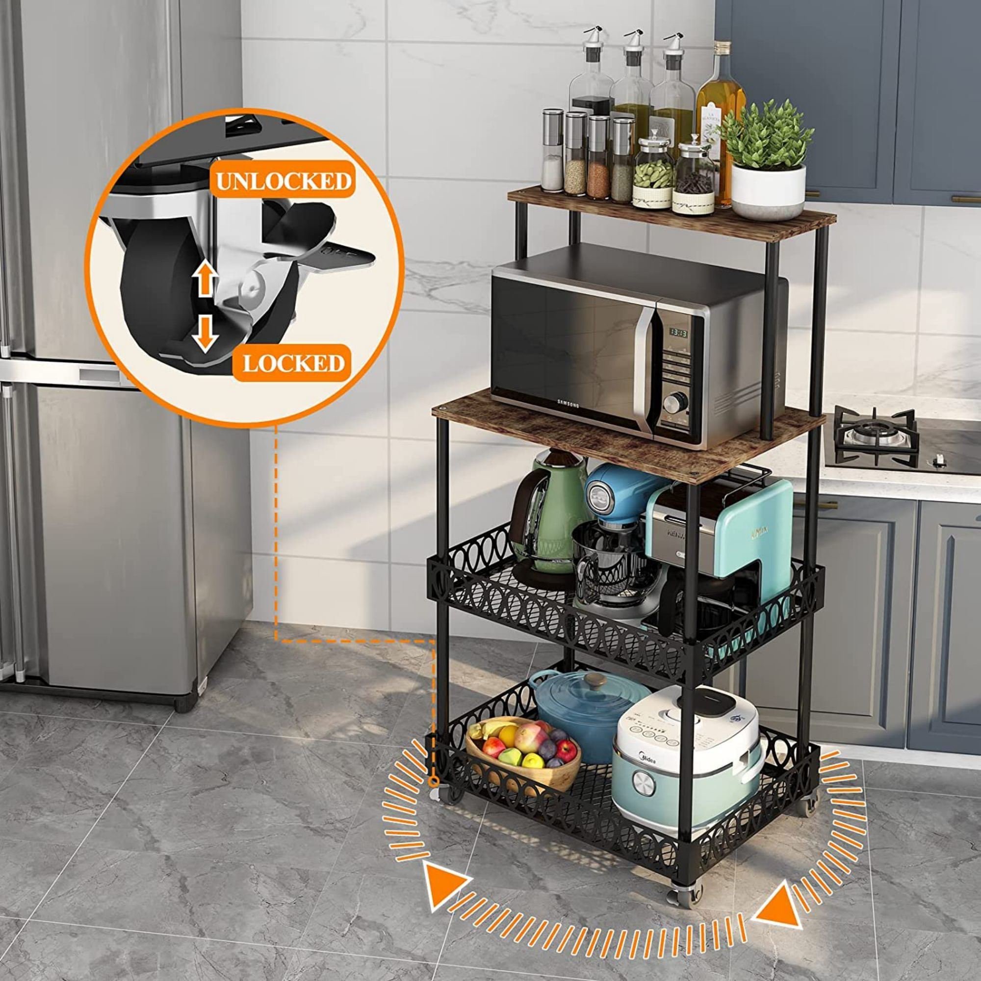 Spoway's 4-storey kitchen bread rack, heavy-duty vertical kitchen storage bread rack with rollers, and upgraded industrial microwave rack The microwave rack is a 4-storey open kitchen rack. The upper shelf houses microwave ovens, coffee machines, spice bottles, and kitchen decorations. The bottom two shelves hold kitchen supplies, such as vegetables and cooking utensils. Keep snacks and fruits, chargers, and keys in the living room; For garages, place automotive products, wrenches, etc. Multiple uses, saving every inch of your space! Equipped with bottom wheels and locks, easy and safe to move! Kitchen shelves for spices, pots, and pans [not just kitchen shelves]: Whether it's a snack rack, coffee bar, flower rack, or decorative rack, this kitchen shelf organizer can meet all needs.