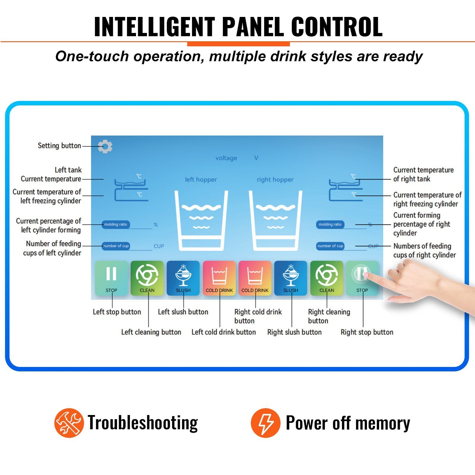 4.Precise Control Panel: This slushie machine is equipped with an easy-to-operate panel. Each bowl can be operated independently, with a clear digital display at a glance. Adjusting the thickness according to your needs has never been easier. The simple one-touch operation allows serving your favorite frozen drinks. There are also thoughtful settings for fault diagnosis and power failure memory.